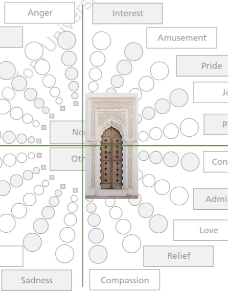 However, some of these emotions are special. The special area of interest has slightly positive valence. I denote it with a door. In the illustration below, this door is centered near the origin and only covers part of the y-axis. However, this is an artifact of my limited artistic ability. The special emotions extend across the y-axis in both the positive (interactive) and negative (effortlessness) directions, hugging the positive side of the x-axis.